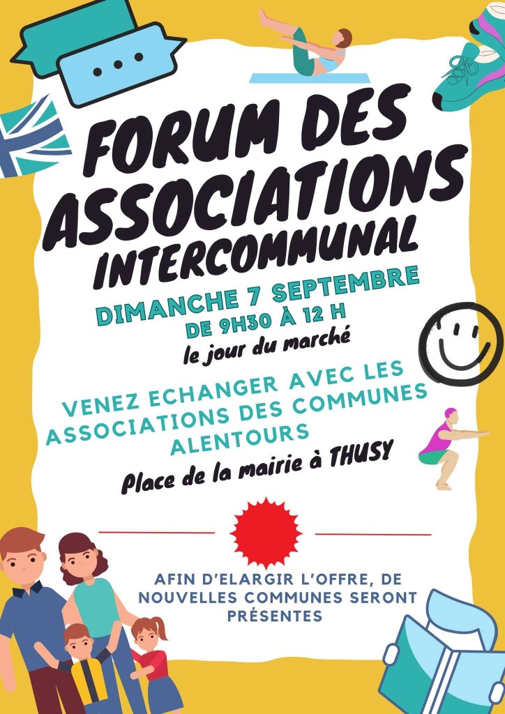 Le Forum des Associations revient à Thusy ! Rendez-vous le dimanche 7 septembre de 9h30 à 12h sur la place de la mairie (et en même temps que le marché